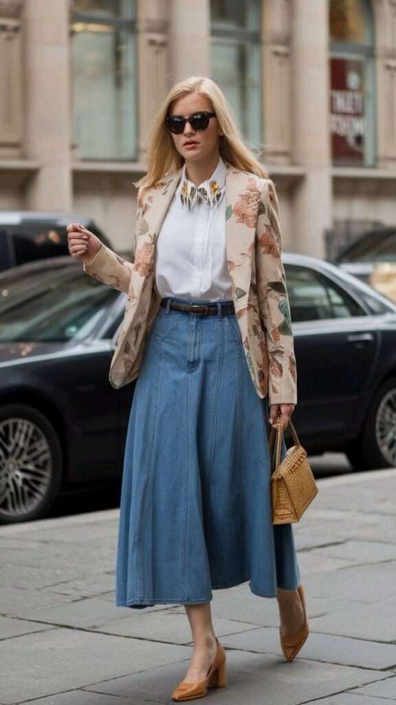 Oваа среда носиме широко, тексас здолниште во комбинација со бела кошула. На овие парчиња облека додаваме беж блејзер со цветен дезен.