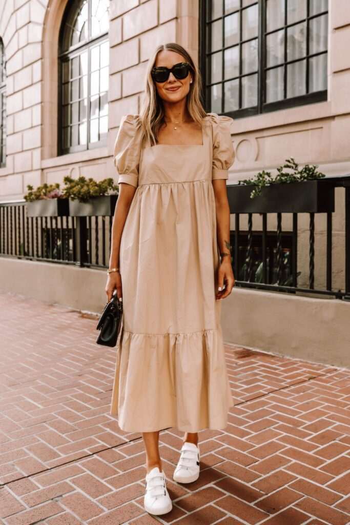 Среда во романтичен беж фустан Денешниот ден е скроен за миди фустан со пуфкасти ракави. Ова романтично парче облека со набори, ќе го комбинираме со бели патики и црна чанта. Вака стилизирани ставаме очила за сонце и ви посакуваме среќна среда. Photo: Pinterest Previous Article Каде летуваат Кејт Мидлтон и принцот Вилијам? Next Article Комбинезони - едно парче за многу стилски решенија