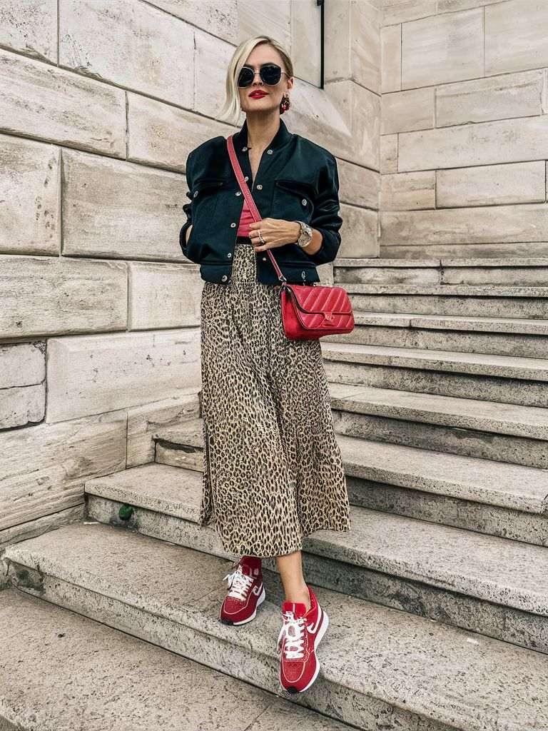 Здолништето го комбинираме со црвена блуза и патики во иста боја.