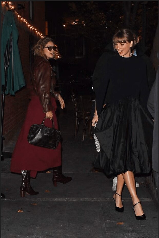 Ahead of her latest tour in Vancouver, Taylor Swift enjoyed a dinner date with Gigi Hadid in New York City. The two stars spent the evening dressed in outfits worthy of a holiday party. Hadid opted for an all-burgundy ensemble, complete with a leather jacket and knee-high boots, while Swift looked elegant in a black midi dress with a voluminous skirt. She completed her unique styling with black heels, diamond earrings, and a silver handbag that added a special touch to her outfit.