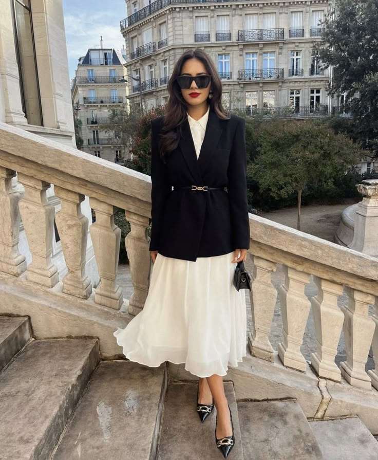 Нашиот предлог е бело миди здолниште коешто го спојуваме со бела кошула, а за да направиме контраст додаваме црн блејзер.