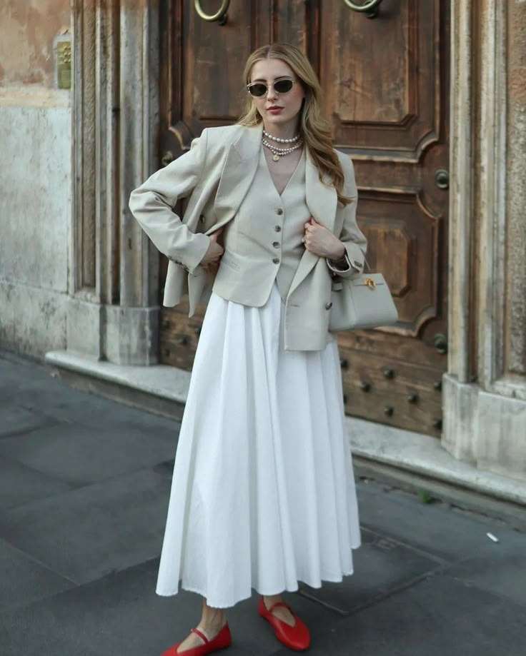 Дополнуваме со рамни, црвени чевли и беж чанта, а финишираме со бисерен накит.