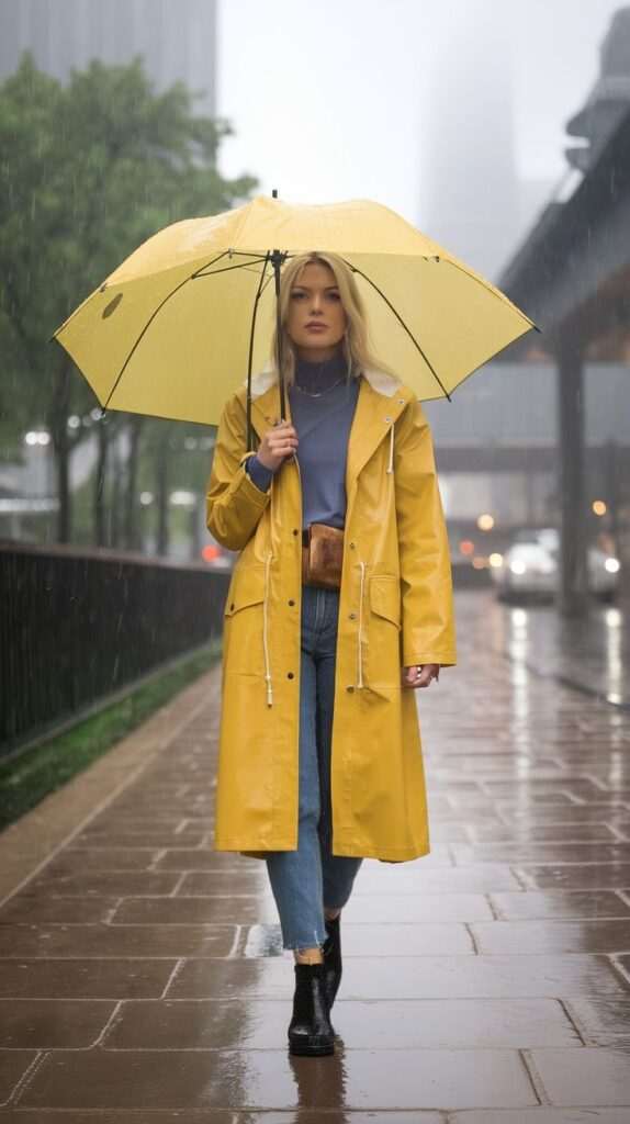 Денешниот стајлинг го прилагодуваме на времето, па затоа нашиот предлог е жолт мантил за дожд.