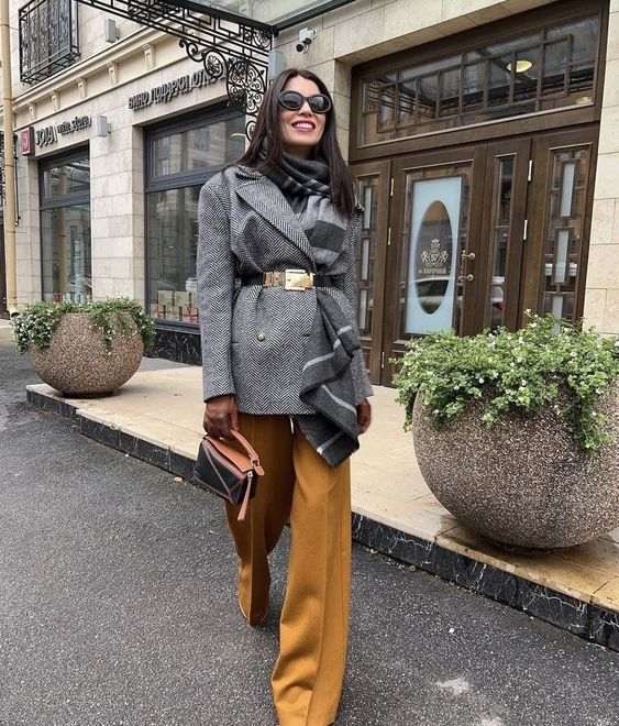 We're coloring this Wednesday in ocher and gray tones - we suggest wide ocher pants with a hem that we pair with a short gray coat.