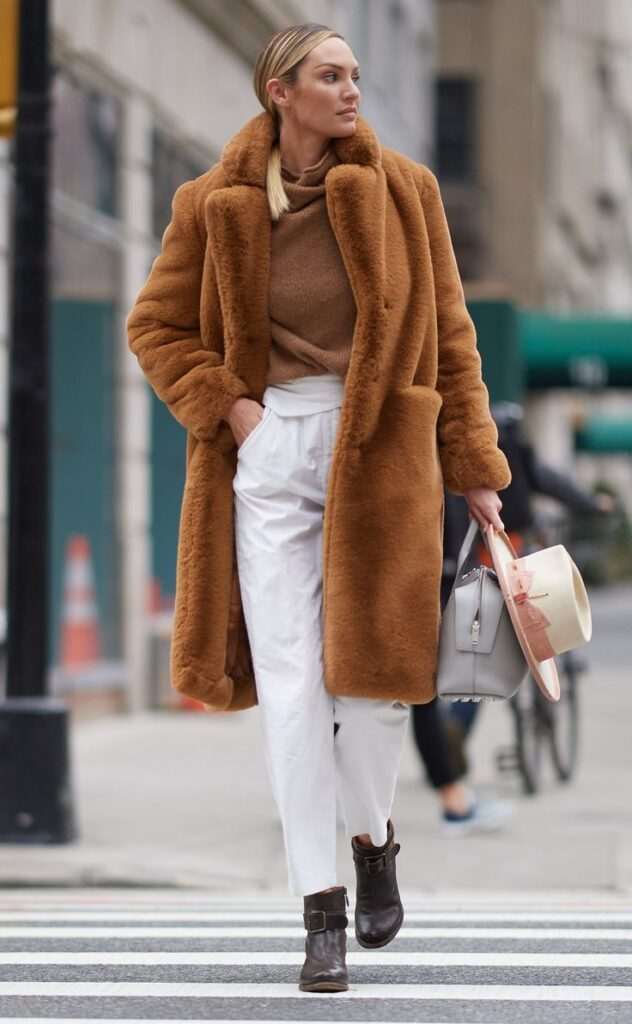 We add a midi fur coat in an ocher shade to these two pieces, and complement it with dark brown ankle boots.