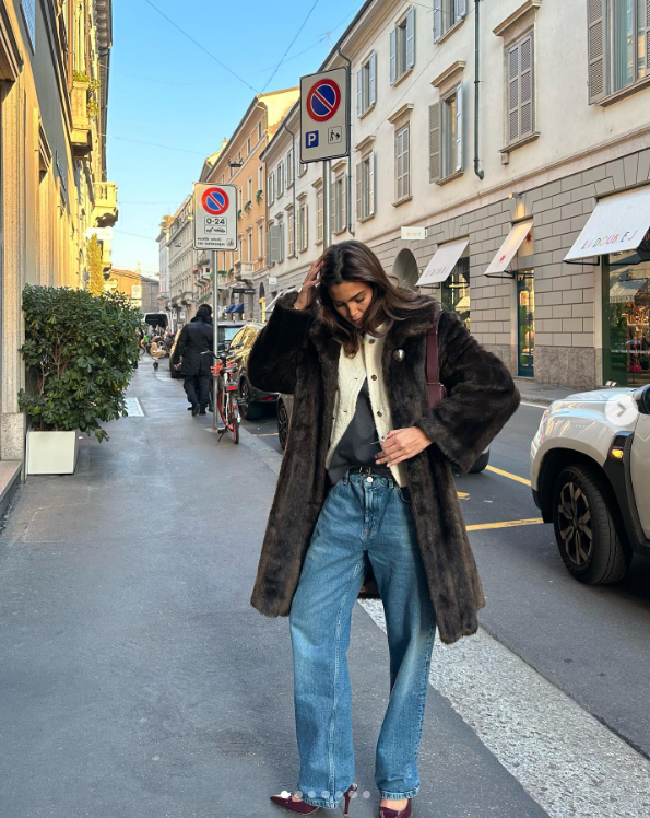 Во нејзиниот гардеробер ќе најдете и кожни чизми, мантил од превртена кожа, широк џинс и сомотски панталони, коишто се идеални за есен.
