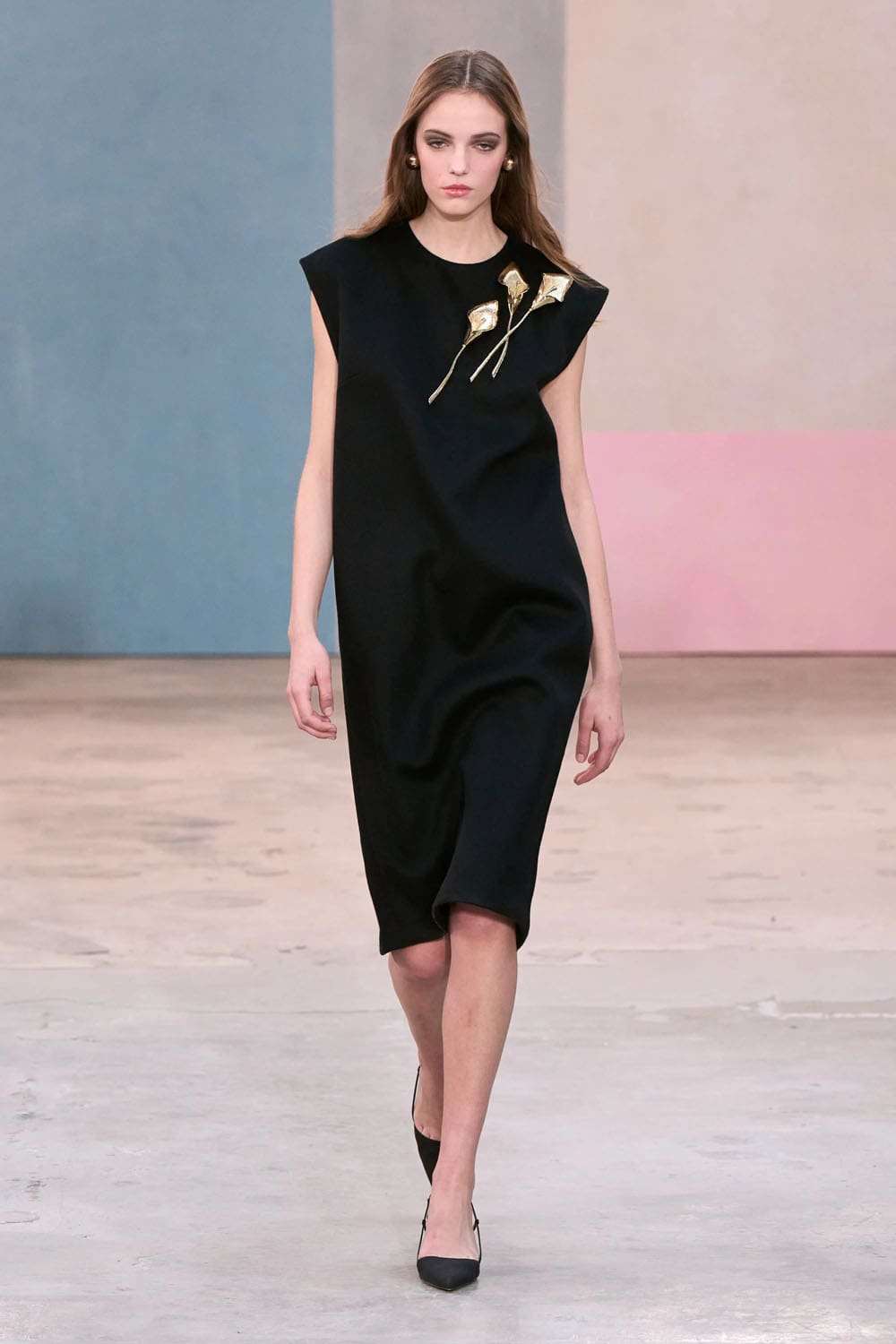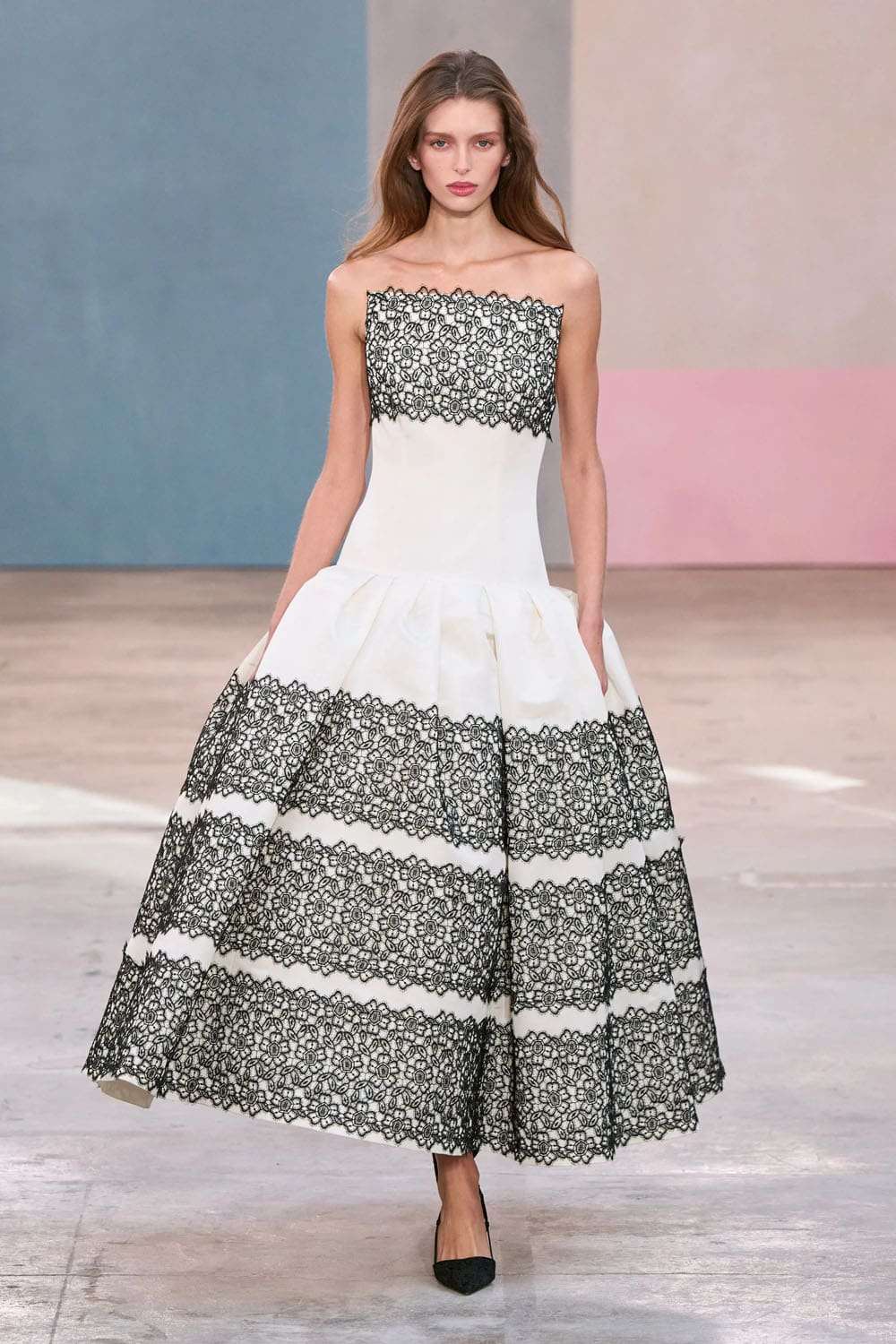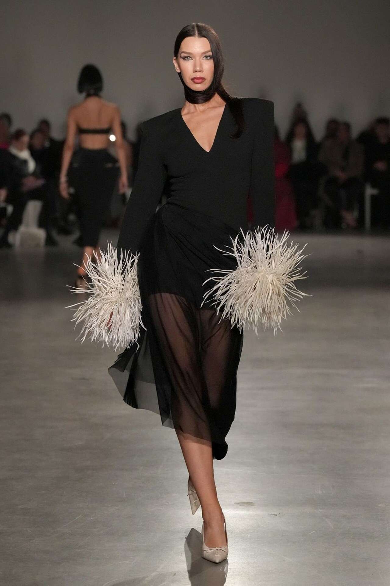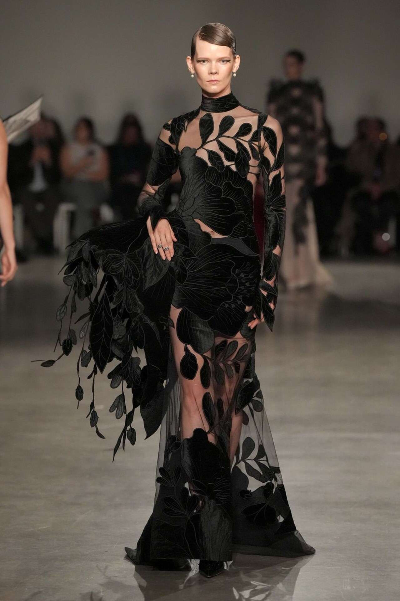 Клучни белези на колекцијата беа структурирани црни и бели силуети што постепено преминуваат во експлозија од боја, текстура и драматични форми, органза, тантела, пердуви и тантелести слоеви што создаваат динамични, театарски драматични „движења“ на пистата, асиметрични деколтеа, драматични тула ракави, микс на сјајни метални детали и ефекти со сеќуации, кои го реимагинираа класичниот вечерен фустан.