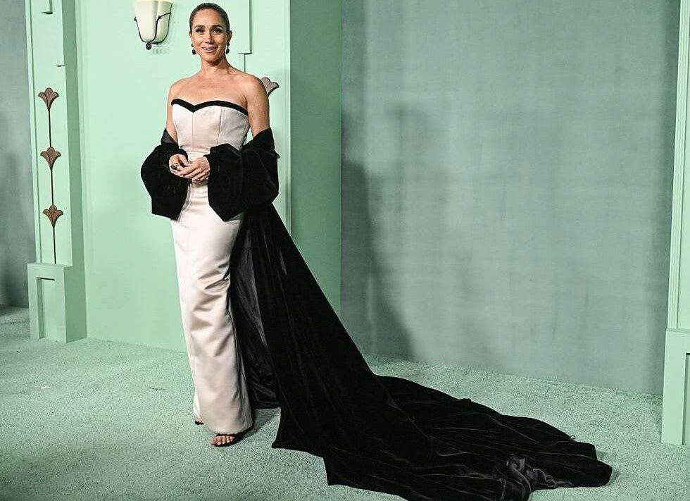 Војвотката од Сасекс се појави во custom фустан од Harbison Studio, потпишан од Чарлс Харбисон, еден од најценетите њујоршки дизајнери познати по софистицирана вечерна мода и архитектонски прецизен крој. Фустанот без прерамки, во суптилна нијанса со црни контури и срцевидниот изрез, ја следеше силуетата на Маркл со класична елеганција, додека драматичниот црн шал со долга опашка внесе јасна референца кон гламуротна стариот Холивуд.