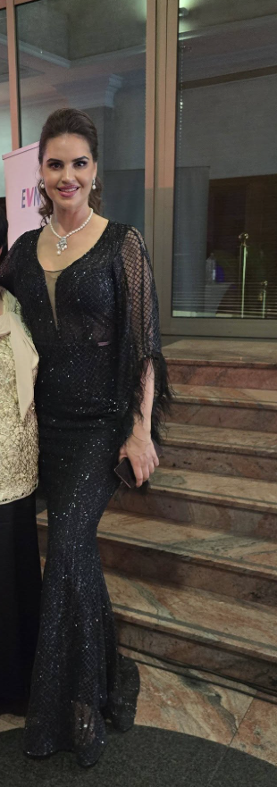 Водителката Вера Мештеровиќ се појави на Виенскиот бал во Скопје во свечена црна тоалета со суптилни кристални детали.