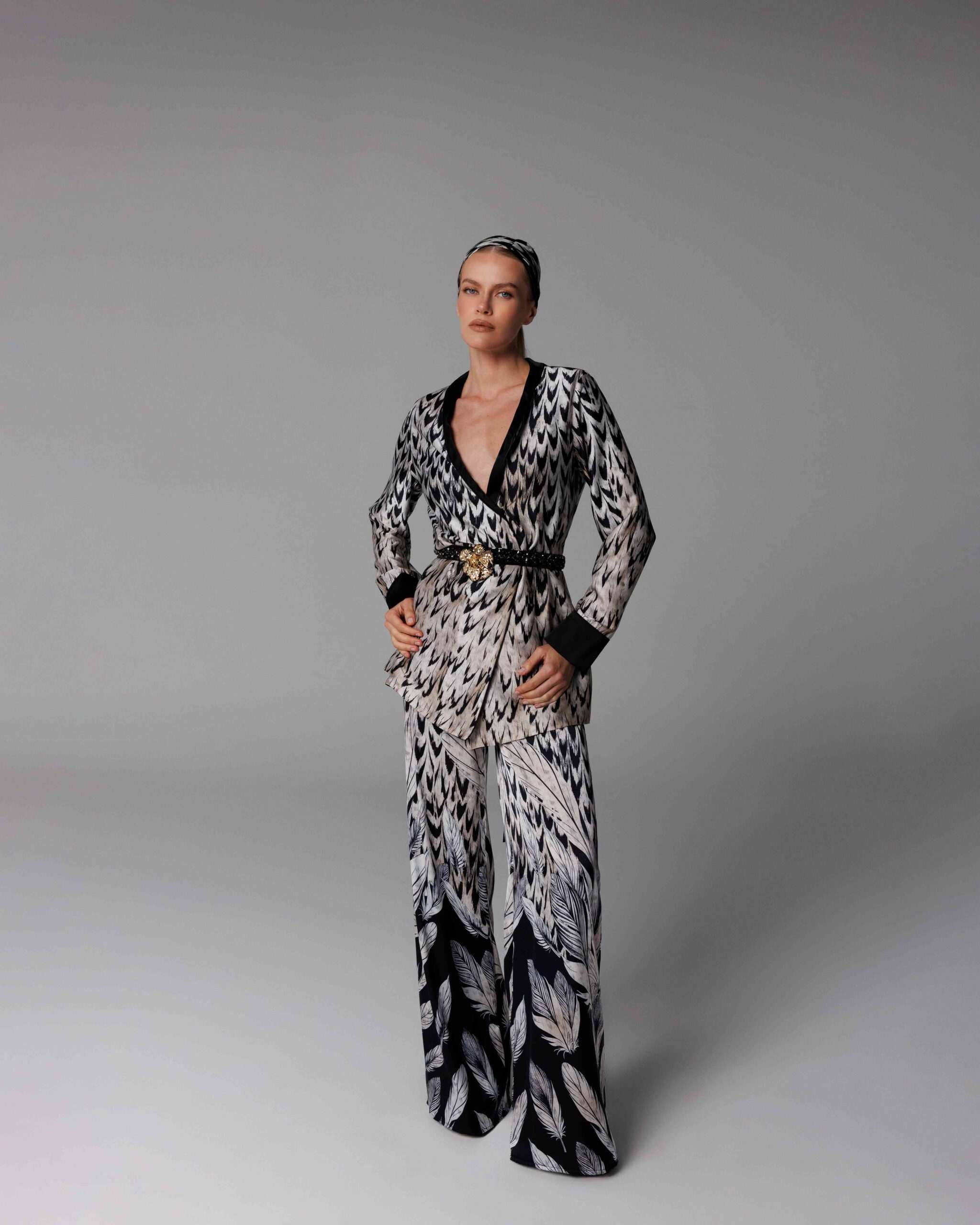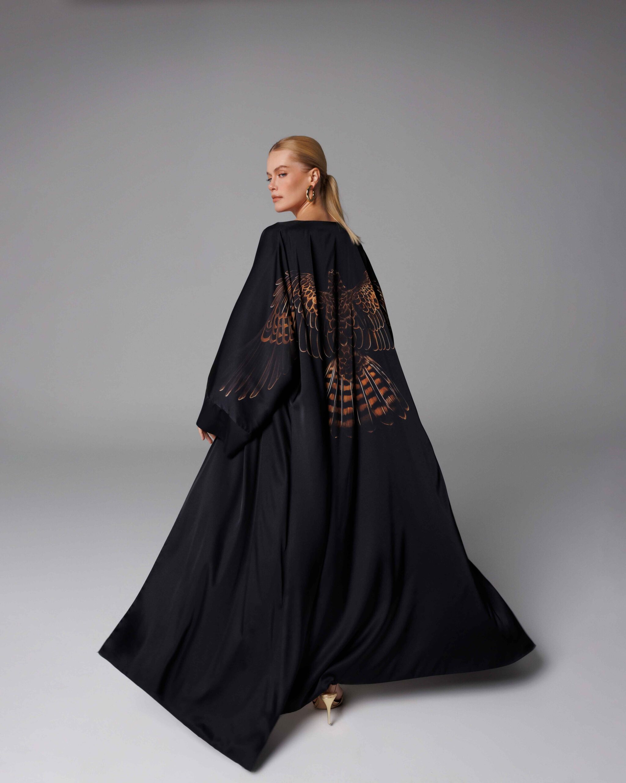 Секое парче е скулптурално обликувано од специјално изработени ткаенини на ЕЛЕНА ЛУКА, создадени ексклузивно за оваа колекција. Принтовите ја одразуваат хипнотичката геометрија на соколовите пердуви — нивната острина, симетрија и непогрешлива моќ. Слоевито изведени во длабоки црни тонови, бронзено-златни нијанси, пустински кафеави и сребрени тонови на ноќното небо, текстилите создаваат визуелен ритам што потсетува на крилја во движење, менувајќи се со секој чекор на носителката.