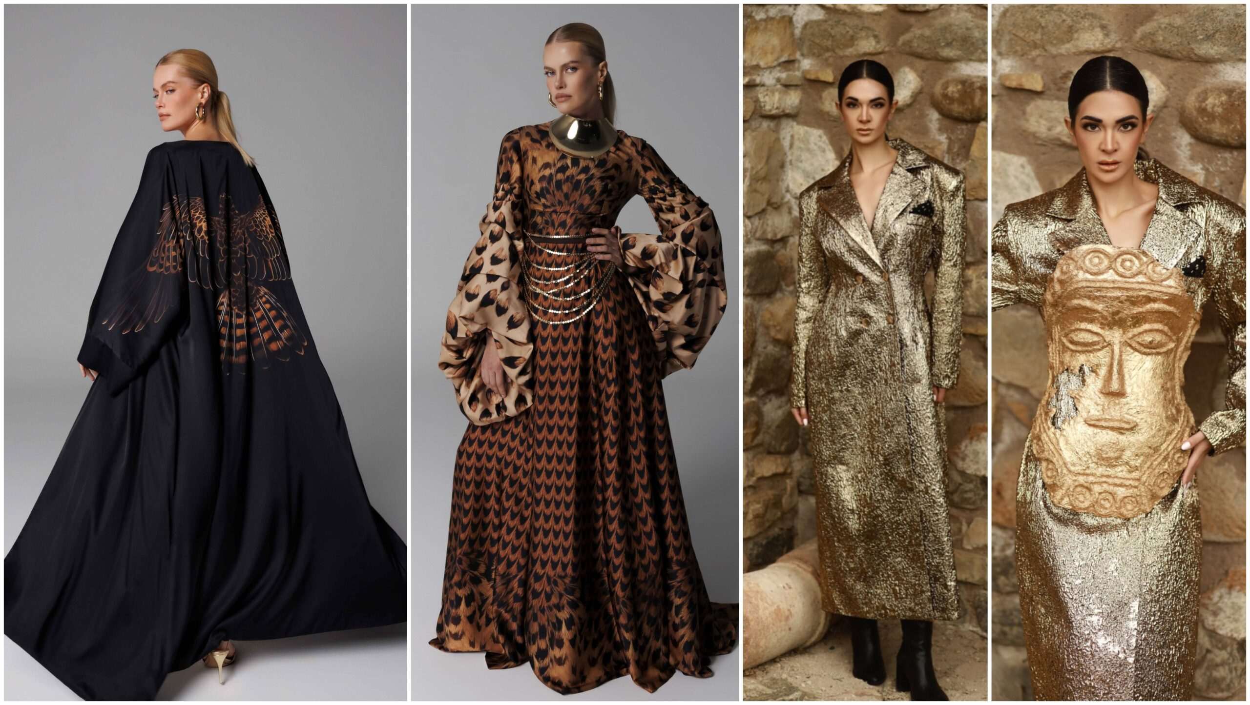 Силуетите ја прегрнуваат поезијата на кралската пустинска облека: флуидни кафтан-форми, структурирани абаи, издолжени фустани и современи интерпретации на традиционалните облици. Дизајните воспоставуваат рамнотежа меѓу раскошот и модерноста — прецизно изработените кроеви се спојуваат со орнаментални детали како вез со златен конец, скулптурални апликации налик на пердуви, метални акценти, рачно поставени монистра и препознатливи соколови инсигнии што ги крунисуваат облеките со јасен и моќен идентитет.