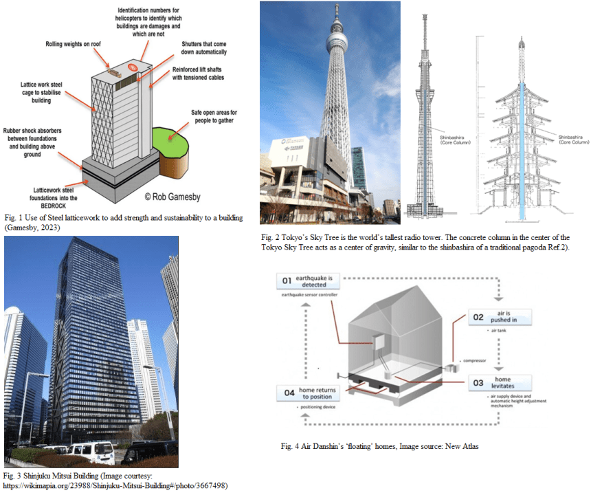 Челичните рамки, комбинирани со армиран бетон, овозможуваат контролирано виткање без колапс. Традиционалната јапонска дрвена архитектура, со своите спојници без клинци, исто така влијаела врз модерните принципи на флексибилност и модуларност.