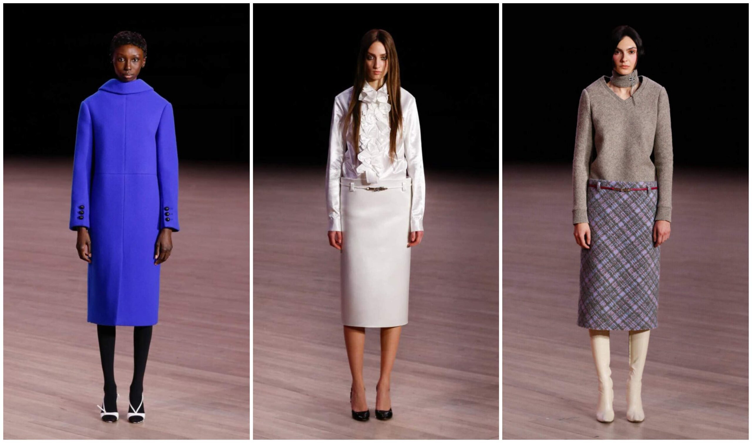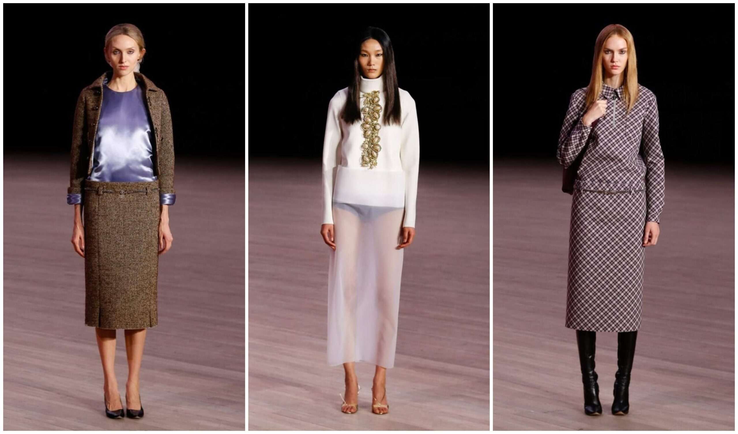 Колекцијата не беше заробена во минатото. Отворањето со сив, сериозен џемпер вметнат во скулптурално пенсил здолниште, комбиниран со чизми до колено, беше суптилен поклон кон минимализмот на 90-тите, истовремено свеж и актуелен. Јакна со ниско струкирано здолниште, носена од Алекс Консани, дискретно се надоврза на современите трендови, но изгледаше како совршен спој меѓу естетиките на Марк и Миуча Прада.