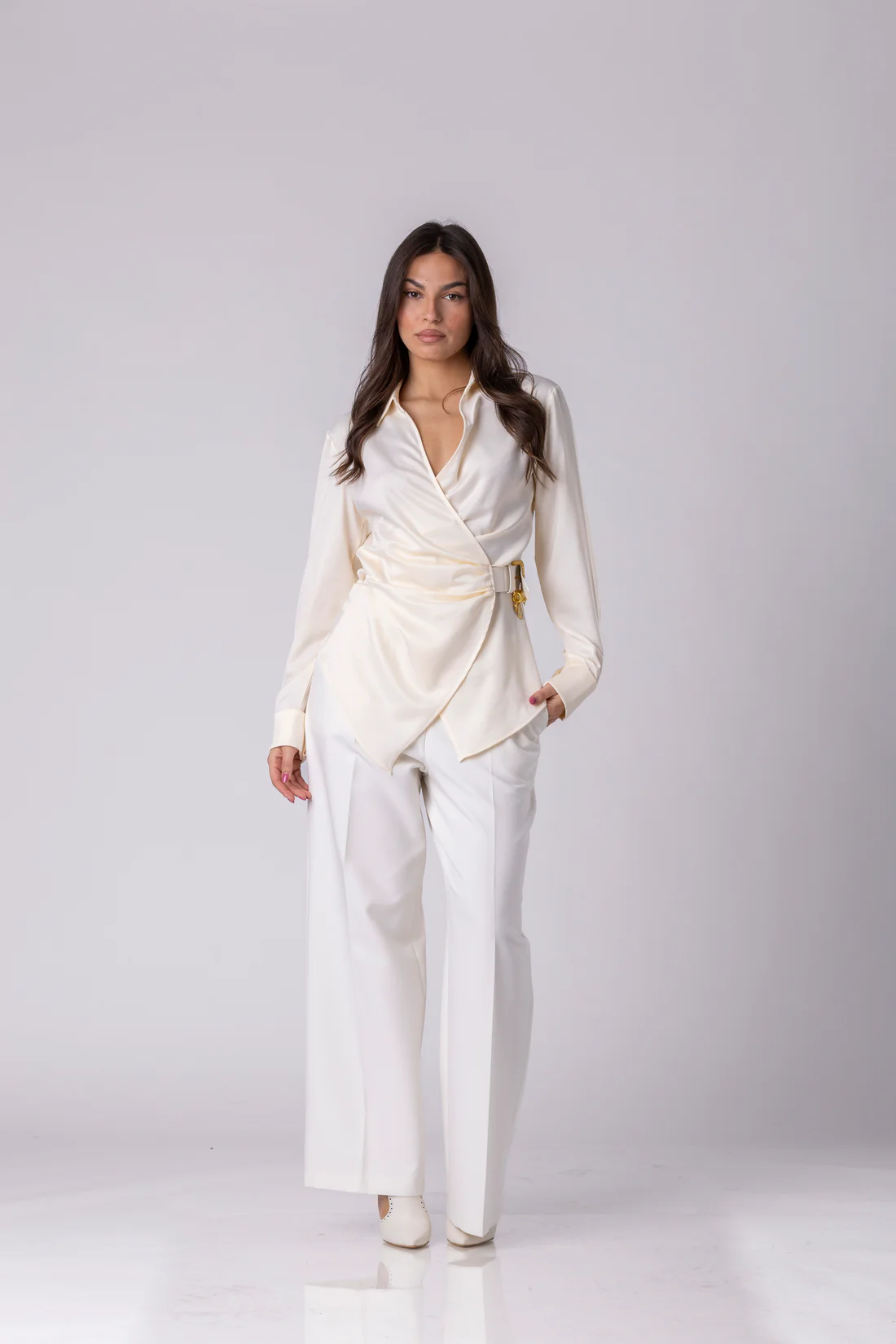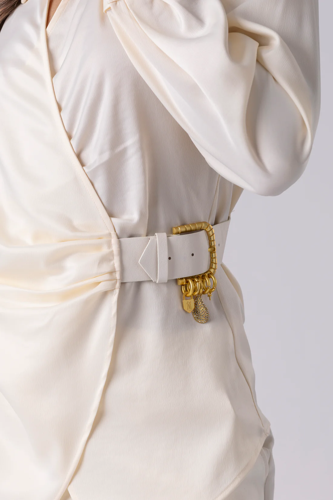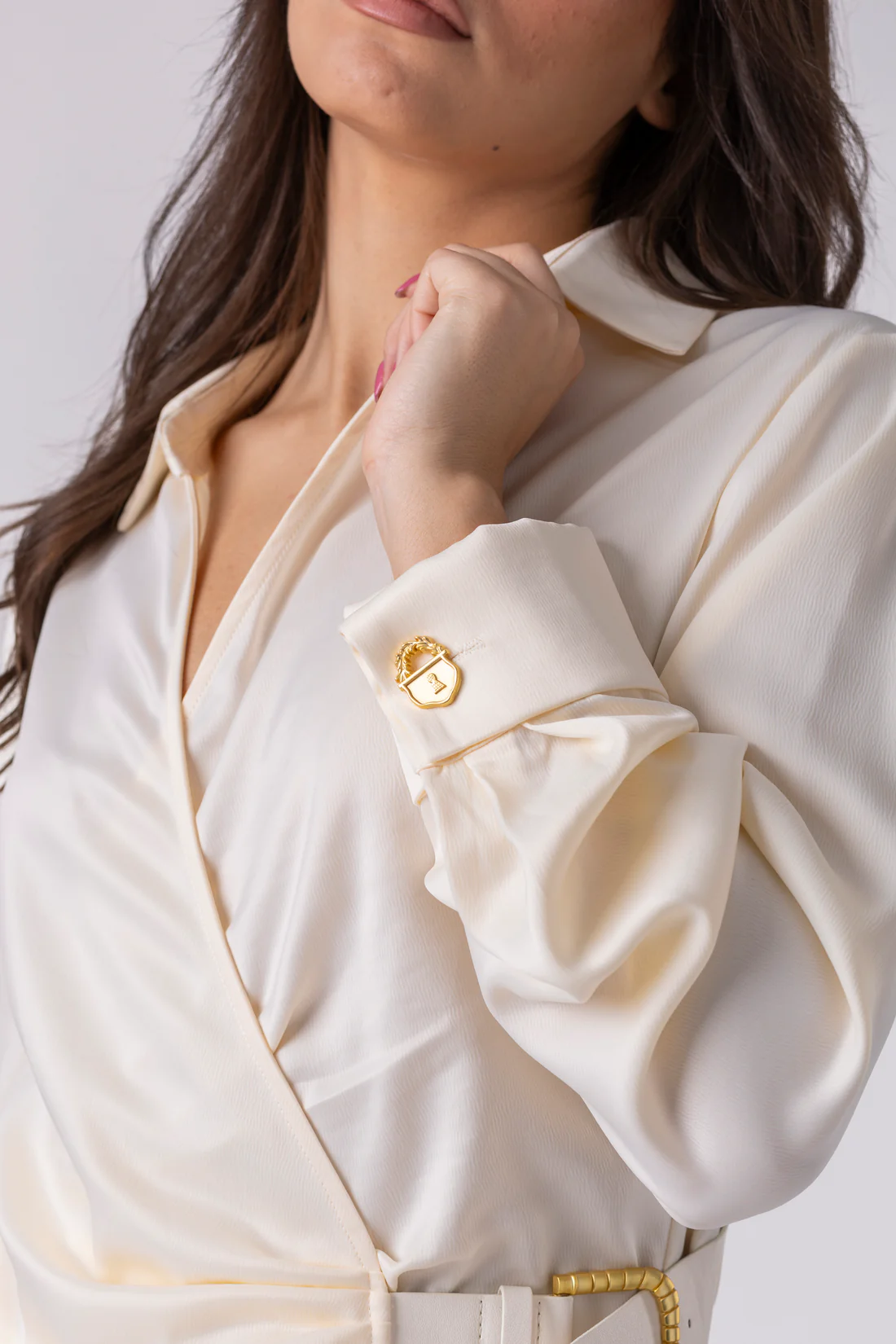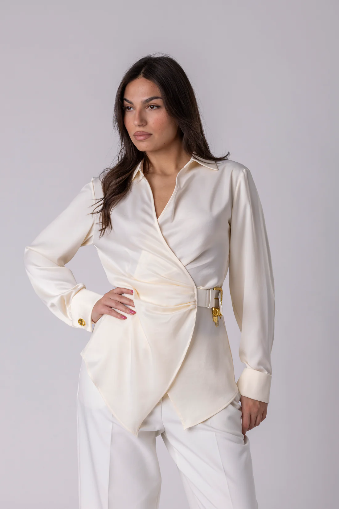 Посебен акцент е интегрираниот ремен со златна метална тока и декоративни приврзоци, внимателно дозиран дизајнерски потпис кој ја дефинира кошулата и ѝ дава препознатлив карактер, а притоа останува верен на минималистичката естетика. Тоа е детал што зборува за моќ, не за раскош.