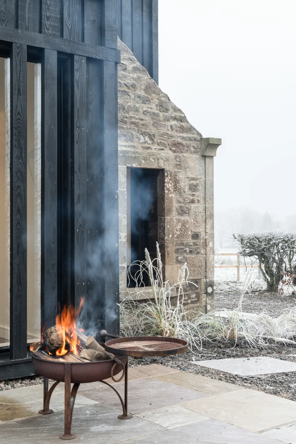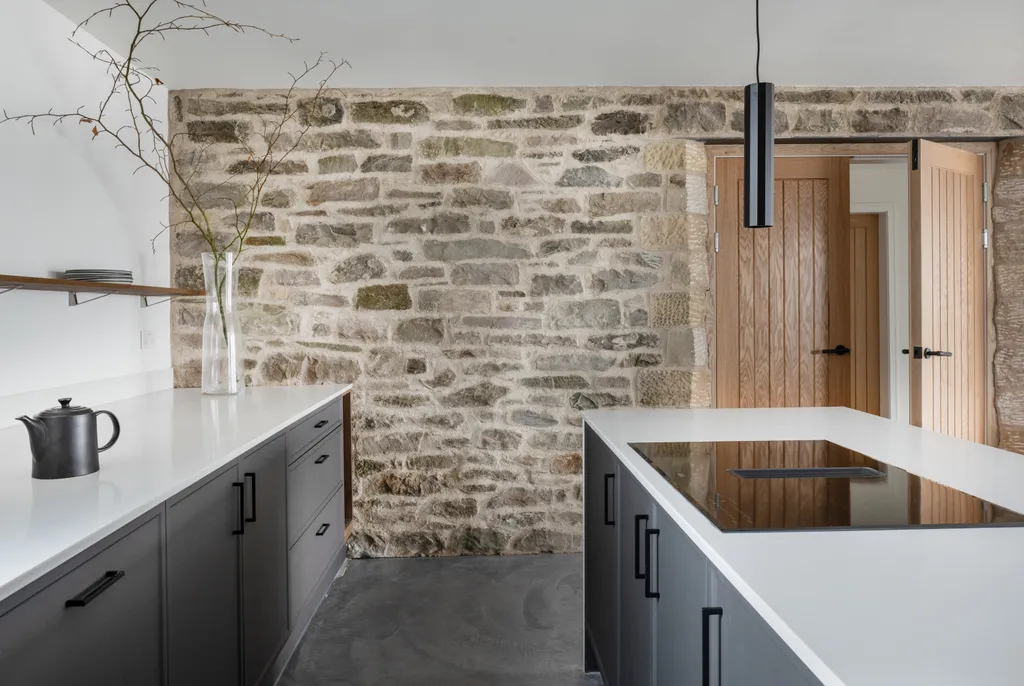 Темната фасада создава визуелно впечатлив контраст со оригиналната светла камена структура. Во ентериерот, камењата беа внимателно спасени, исчистени и рачно сортирани, а потоа повторно искористени како впечатлив ѕид во кујната.
