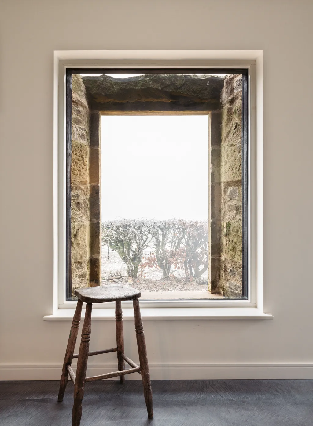 „Ги усогласивме совршено зад оригиналните камени отвори, но малку повисоко, за да се видат камените надпрозорци. Однатре, пејзажот изгледа прекрасно, дебелата камена рамка делува како масивна слика, совршено врамувајќи го погледот. Навечер, кога светлината почнува да исчезнува, мекото надворешно осветлување го истакнува каменот, и чувството на старата куќа навистина оживува во самрак.“