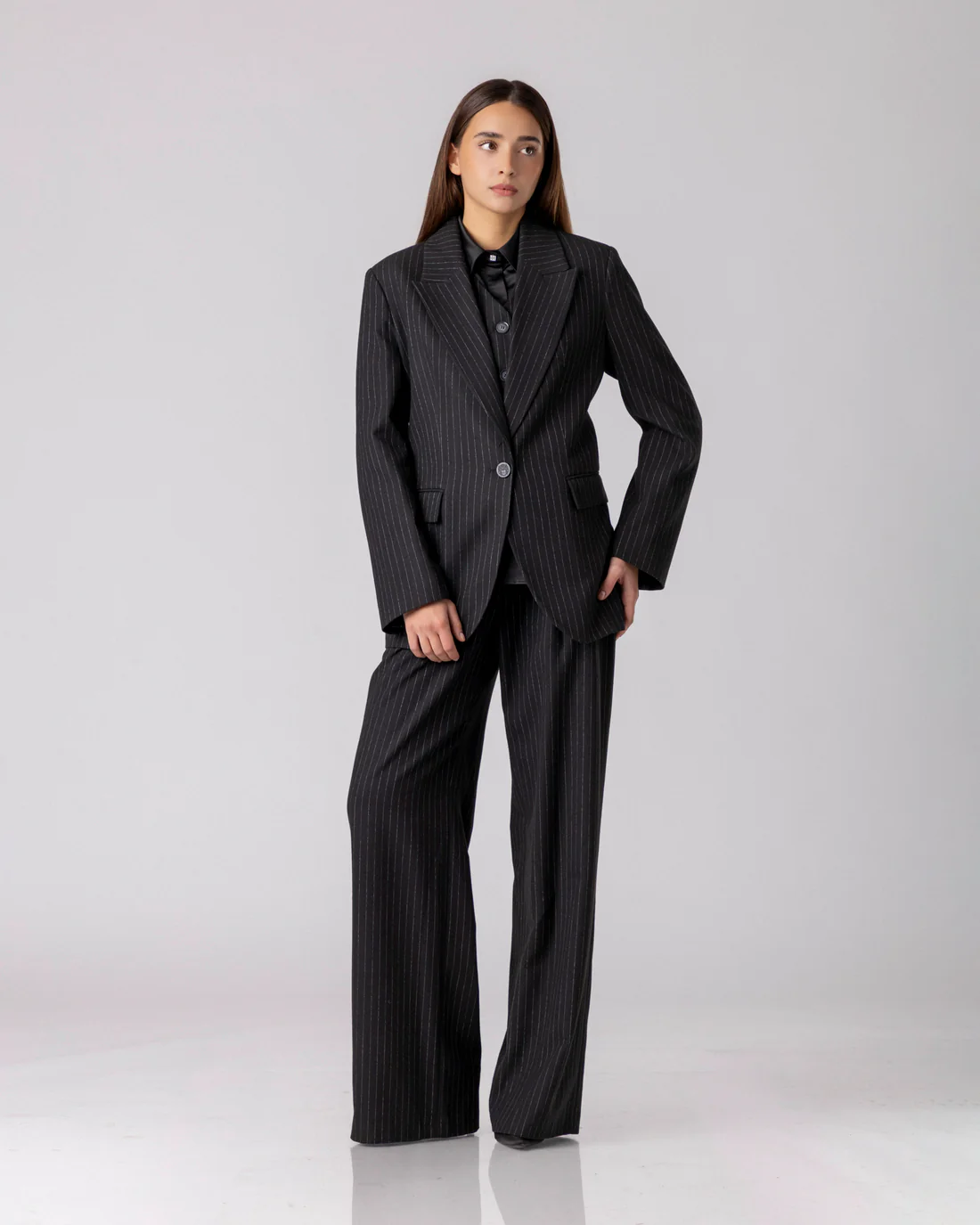 VIRENTH токму затоа делува како парче со дискретна, но целосна доминација. Сакото не се наметнува со декоративни елементи, туку со пропорција, линија и авторитет. Панталоните ја следат линијата на телото и се во ист материјал како и сакото.