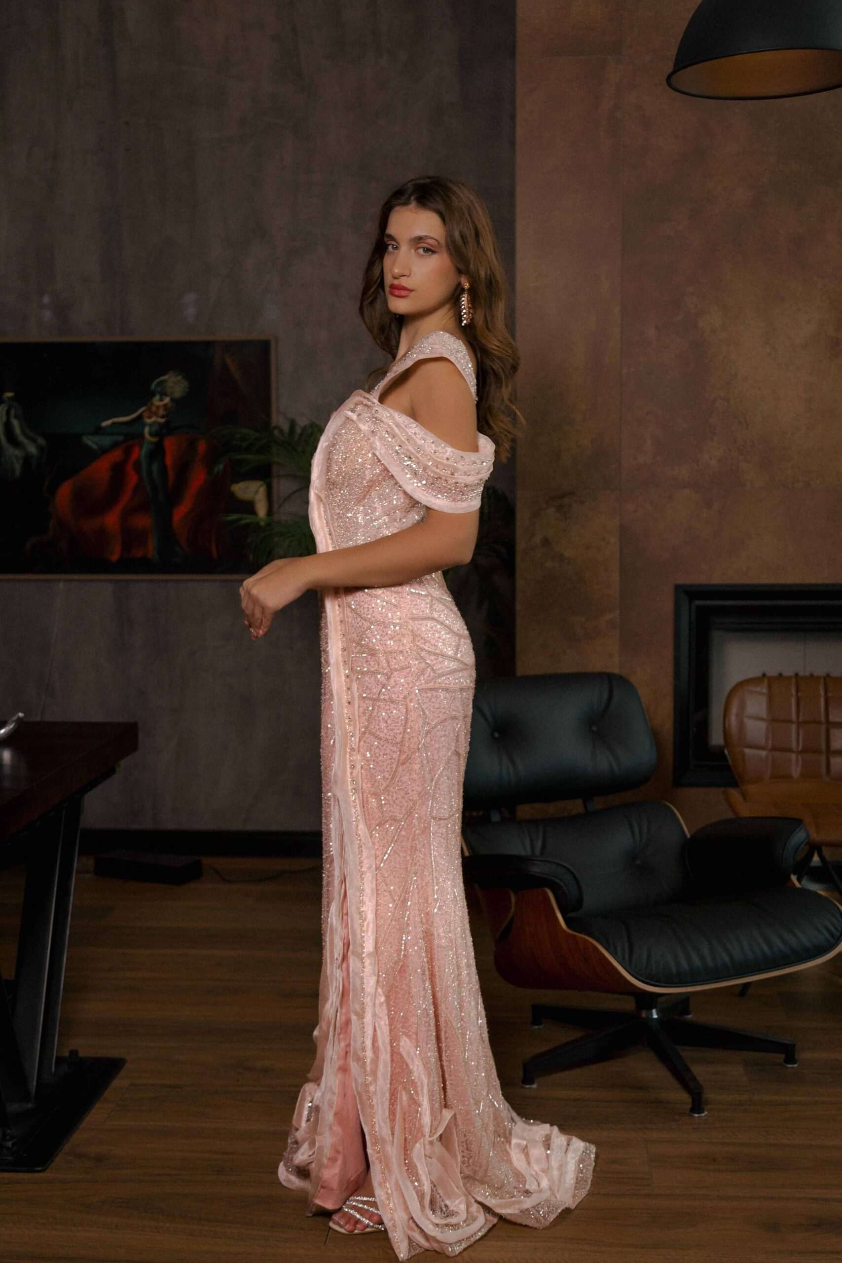 Смел преден шлиц открива самодоверба, додека суптилниот сјај на везените светки ја слави елеганцијата. Blush Mirage е создаден за жената што поседува тивка сила — нежна, блескава и незаборавна. Таа не го следи моментот; таа го создава.
