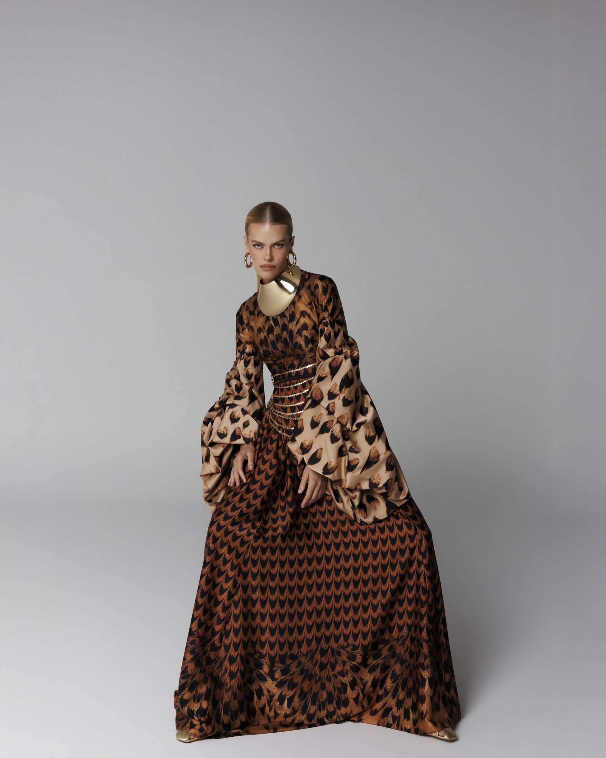 Скулптурално обликуван од специјално изработен текстил со пердувест принт во изгорено бронзена и пустинско црна нијанса, фустанот ги евоцира раскошните пердуви на кралски сокол подготвен за воздигнување. Неговата силуета е истовремено монументална и течна, замислена да се движи како една величествена форма — империјално присуство што лебди низ просторот.