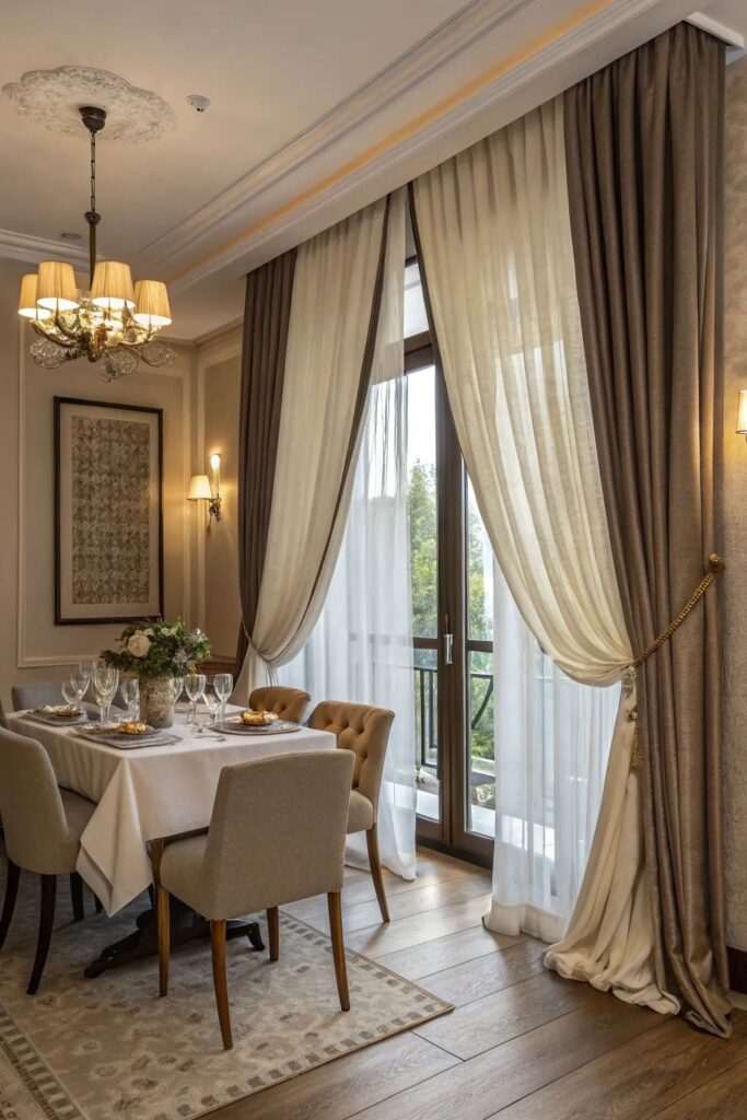 Токму деталите ја дефинираат луксузната нота. Квалитетни корнизи, декоративни држачи, реси или суптилни везови додаваат уникатност и стил. Комбинацијата на двослојни завеси – лесна, транспарентна завеса и потешка, затемнувачка – овозможува функционалност и визуелна длабочина.