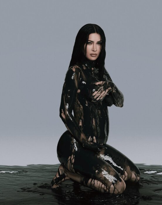 На една од фотографиите Меган седи прекриена со црна маслена боја, додека на другата го покажува позитивниот тест за бременост.
