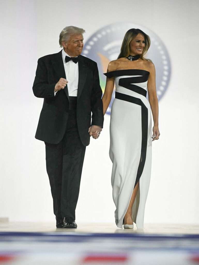 Станува збор за впечатлива бела вечерна креација со црни детали што Меланија ја носеше на балот во 2025 година. Фустанот е дело на нејзиниот долгогодишен соработник, дизајнерот Ерве Пјер, а стајлингот беше дополнет со црн накит инспириран од дијамантски брош.