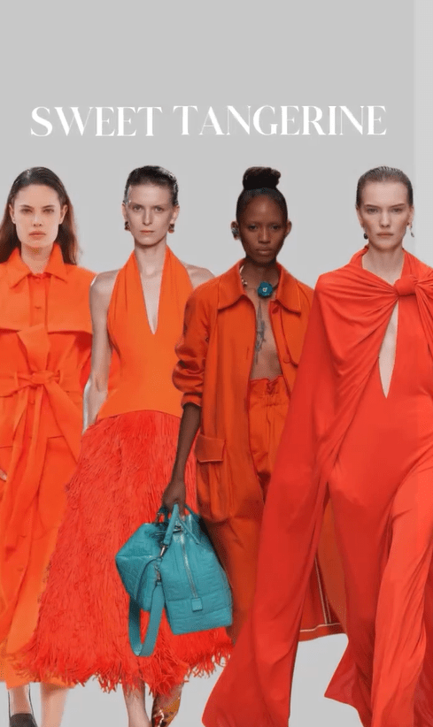Средно до заситено портокалово („Tangerine“, „Mandarin Orange“) ја носи енергијата на оптимизам, креативност и динамика. Овие тонови често се појавуваат како акценти на ревии и колекции што сакаат да асоцираат на светлина, лето и бескрајна енергија.