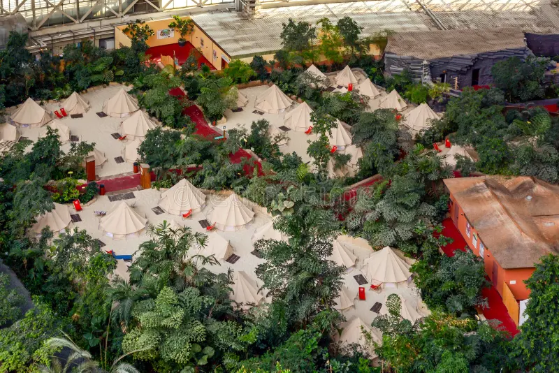 Внатрешноста претставува вистински тропски свет под контролирани услови. Просторот е исполнет со тропска шума со десетици илјади растенија и стотици видови, вештачка плажа долга околу 200 метри, лагуни, базени и водени атракции што функционираат во текот на целата година. Температурата постојано се одржува околу 26 степени, со внимателно регулирана влажност, што овозможува автентично тропско искуство среде Европа.