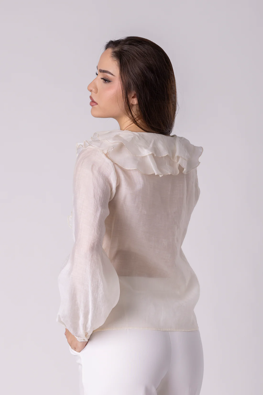 Aveline внесува доза романтична динамика, но со јасно задржана структура. Со полупроѕирна текстура и опуштена форма, блузата дозволува материјалот да се движи слободно, без наметната форма.
