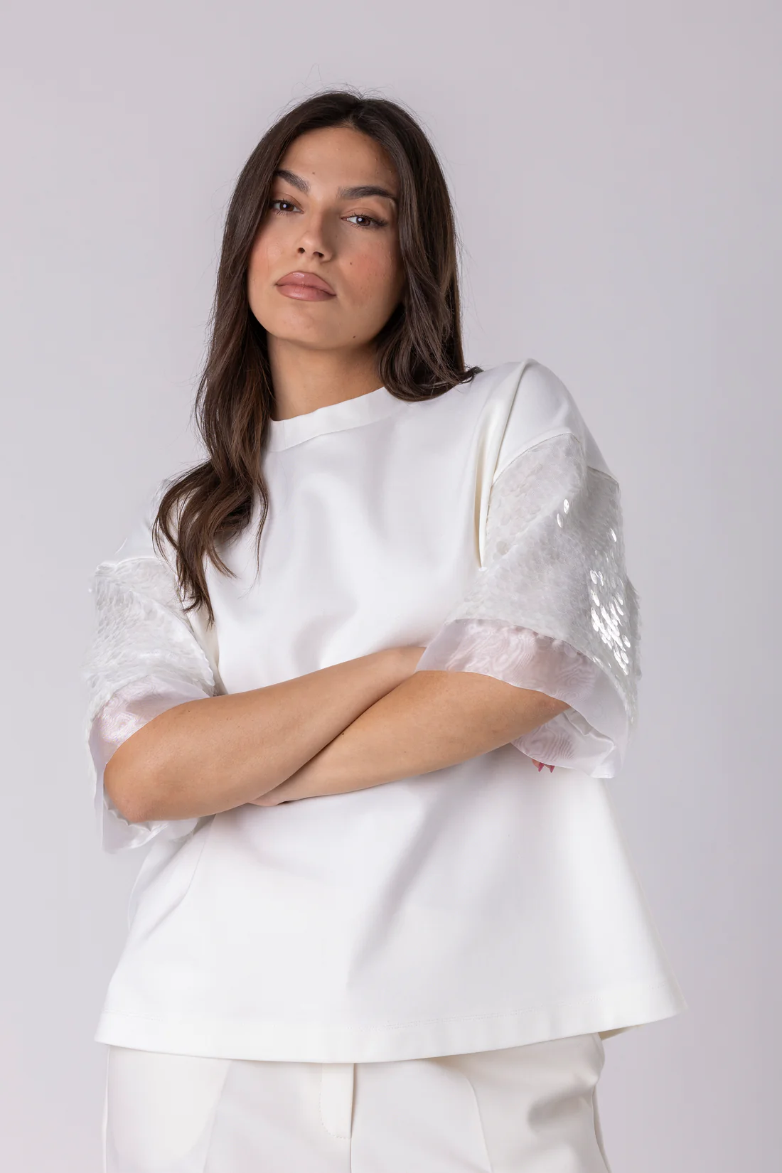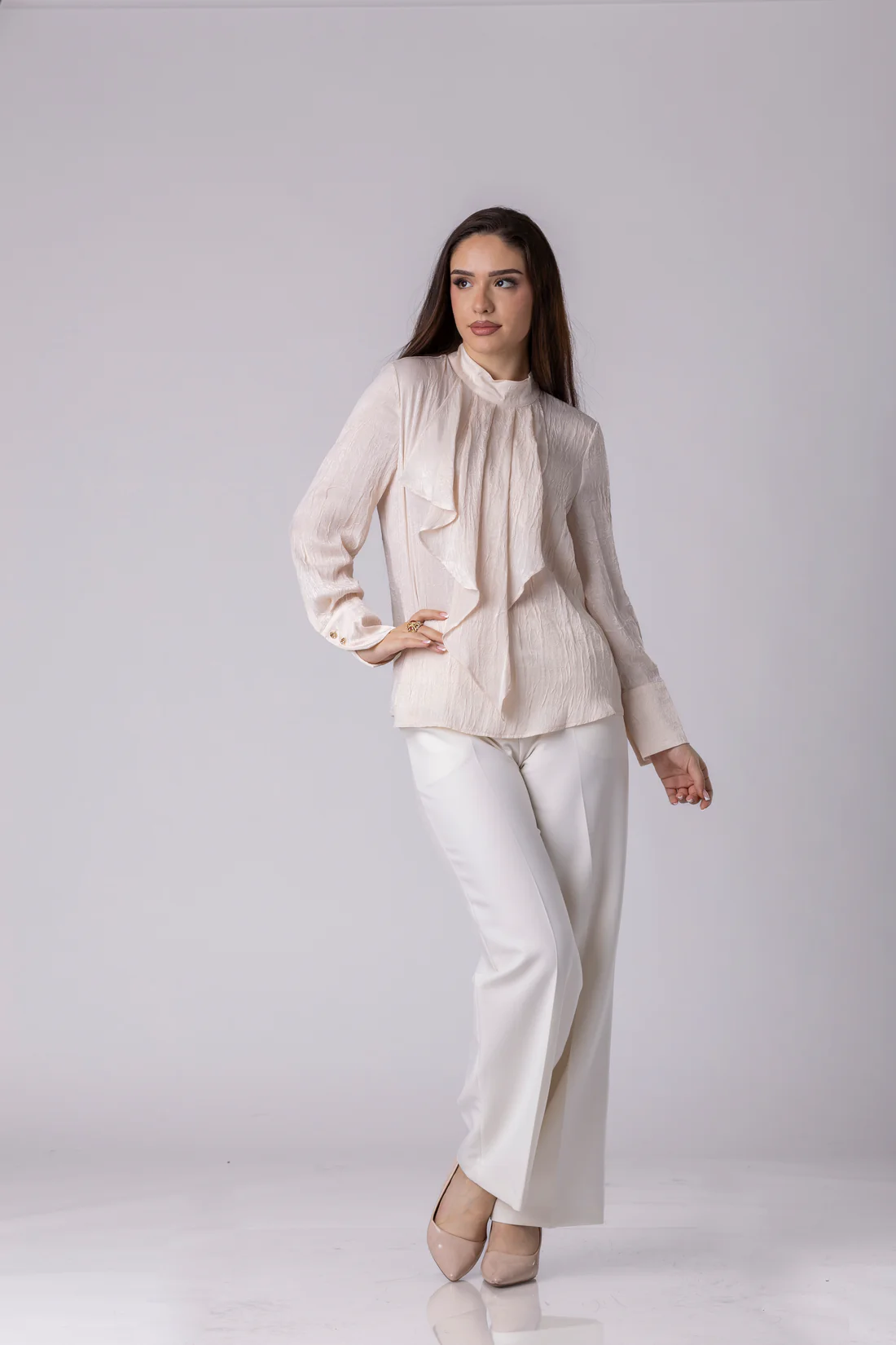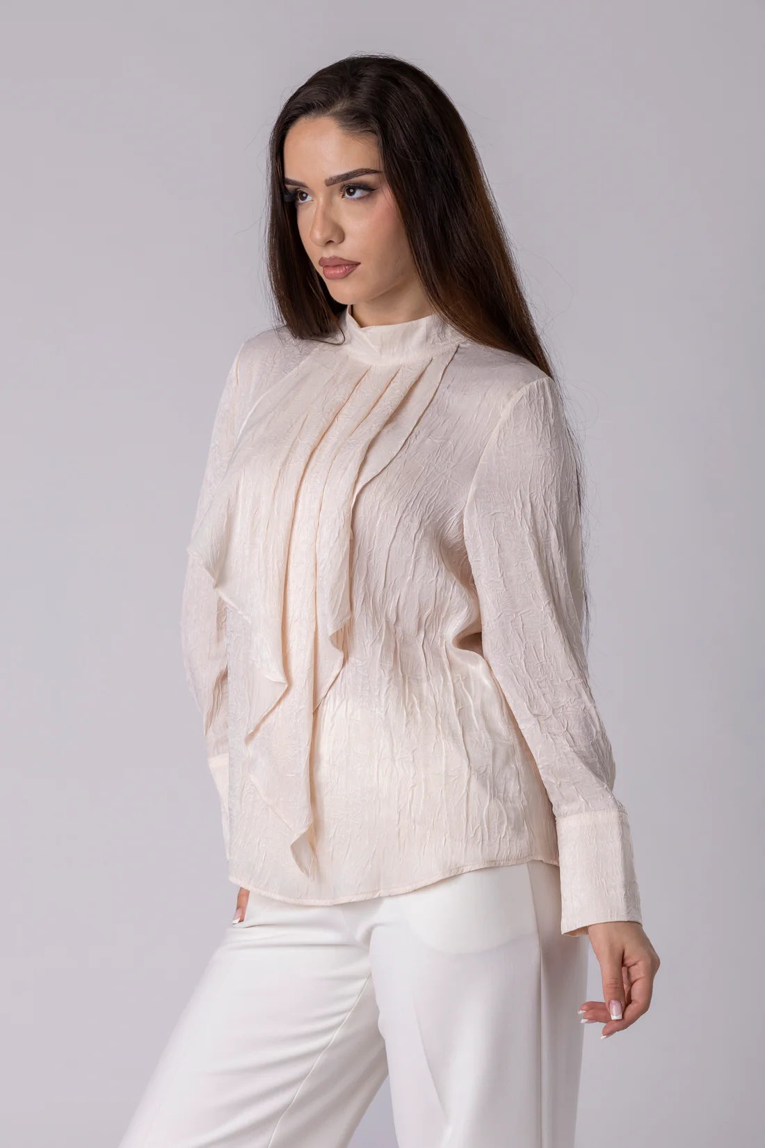 HANAN ја отелотворува нежната страна на современата елеганција. Изработена од лесен, текстуриран материјал, блузата меко се прилепува кон телото, создавајќи природна и софистицирана силуета.