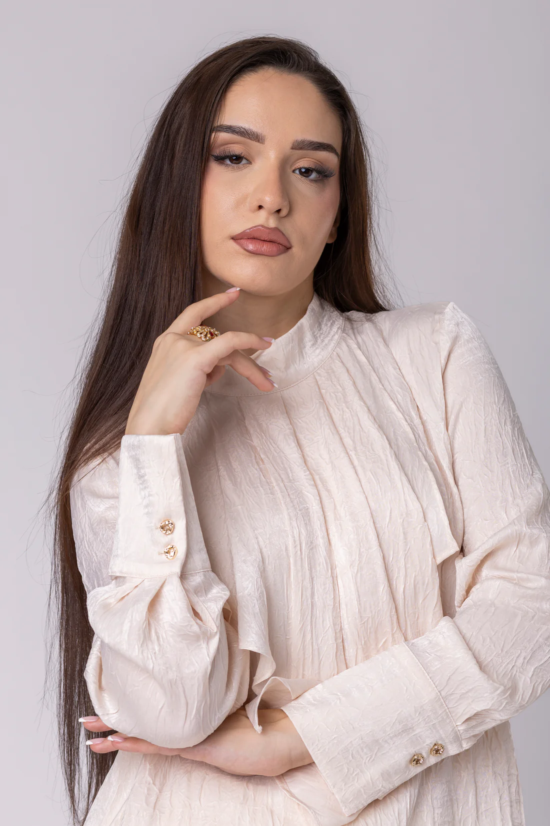 Високиот изрез носи модерна строгост, додека суптилните набори и деликатниот детал на грбот додаваат длабочина и женственост. Токму во тие мали, внимателно изработени моменти се крие нејзината вистинска вредност.