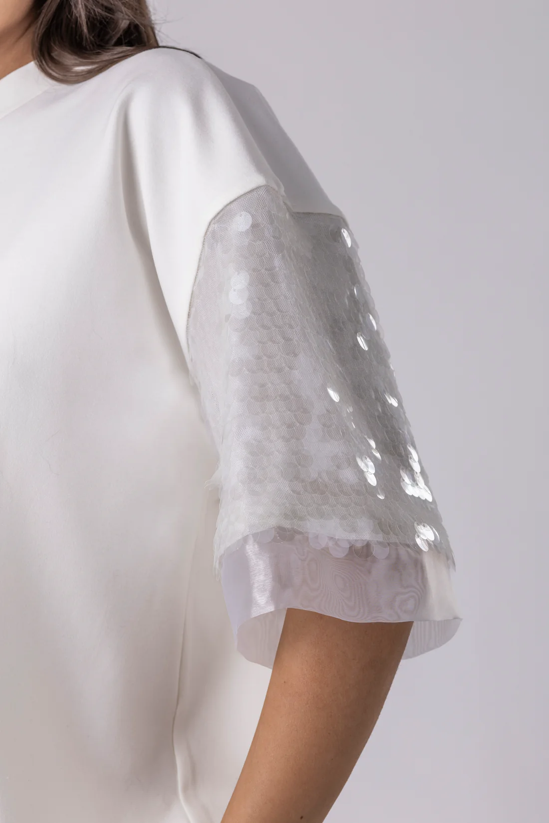Затворениот изрез и воздржаните линии создаваат впечаток на контрола и прецизност, додека ракавите носат суптилен дизајнерски пресврт. Проѕирните mesh панели, украсени со деликатни светкави детали, внесуваат игра на текстури без да ја нарушат чистата естетика.