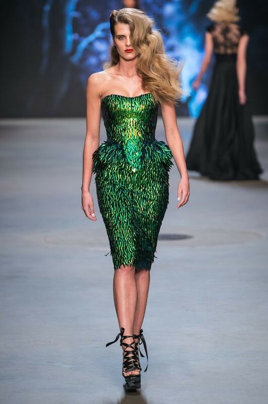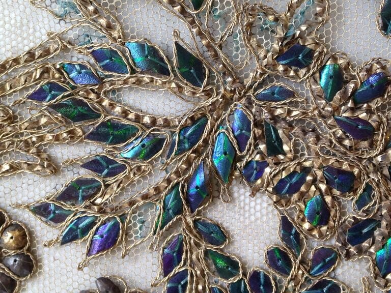 Други познати историски креации вклучуваат „паунината“ фустан на Lady Curzon во 1903 година, кој користел елитри во стил на паунови перја, како симбол на богатство и статус.