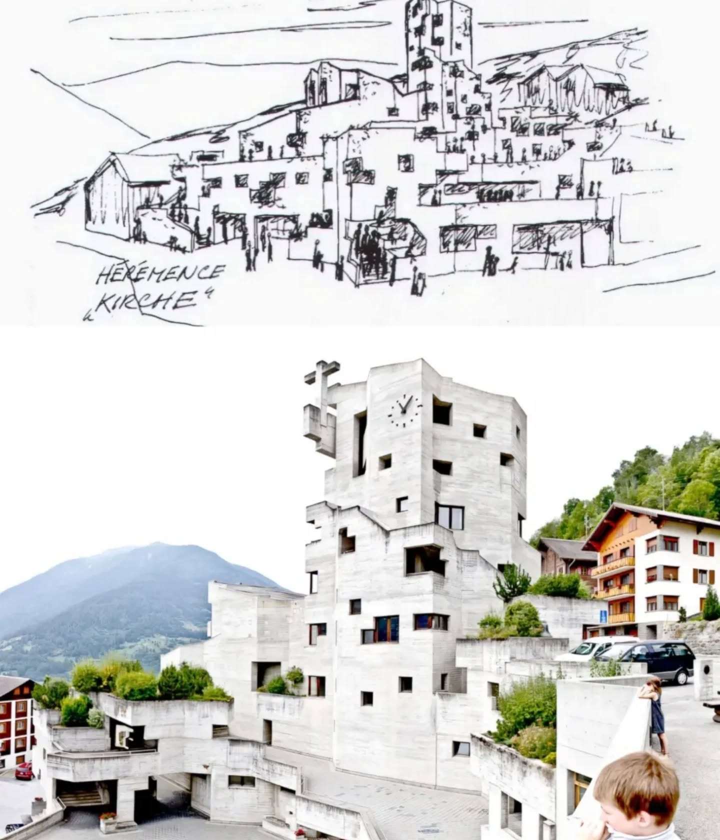 Проектот на Валтер Марија Фердерер, еден од најавтентичните претставници на швајцарскиот брутализам, беше избран како нов духовен и архитектонски центар на селото. Црквата во Ерeманс, изградена од гол бетон, денес се смета за ремек-дело на модерната сакрална архитектура и доказ дека традицијата не мора да биде историски костим, таа може да биде создадена.