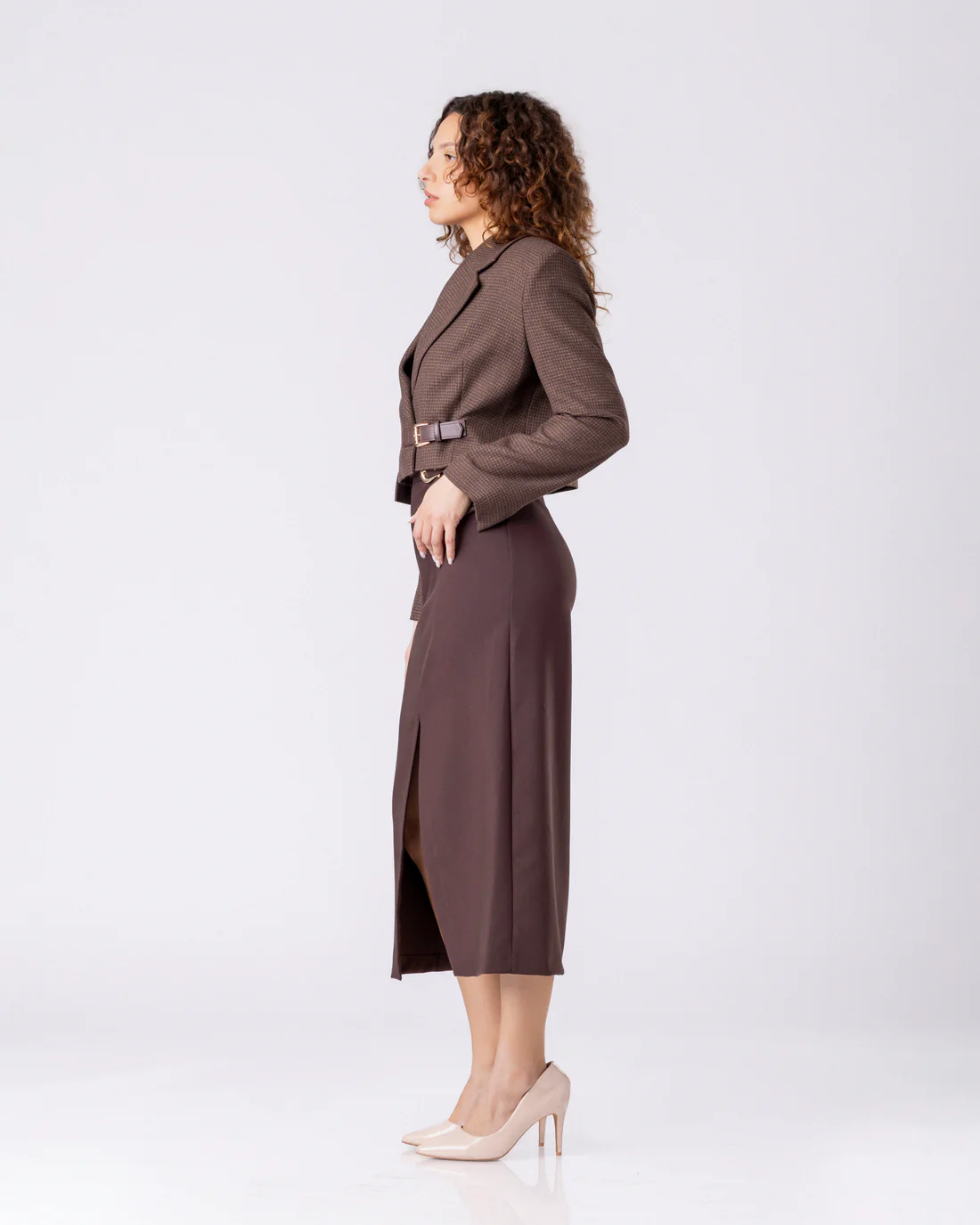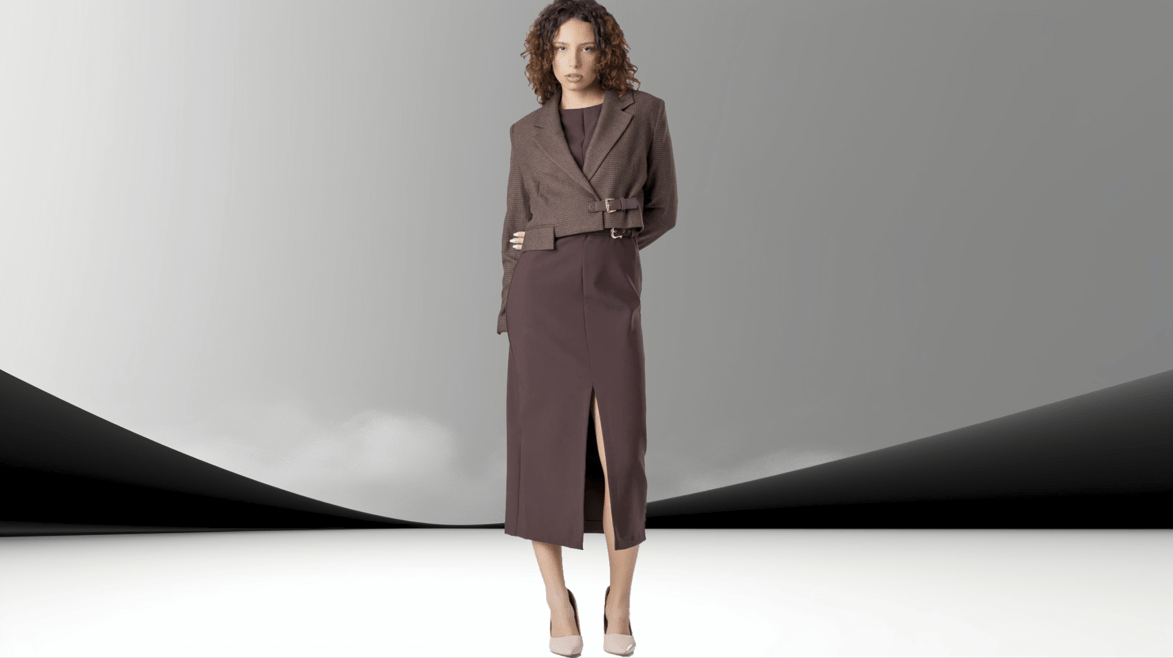 Палтото Structure Buckle oд ELENA LUKA е создадено за жената што предводи со прецизност и присуство. Кроено од богат, мек материјал во кафеава нијанса, ова парче ја спојува машката структура со женствена самоувереност. Кроп силуетата ја истакнува половината, додека препознатливата тока со двоен ремен внесува префинет архитектонски акцент.