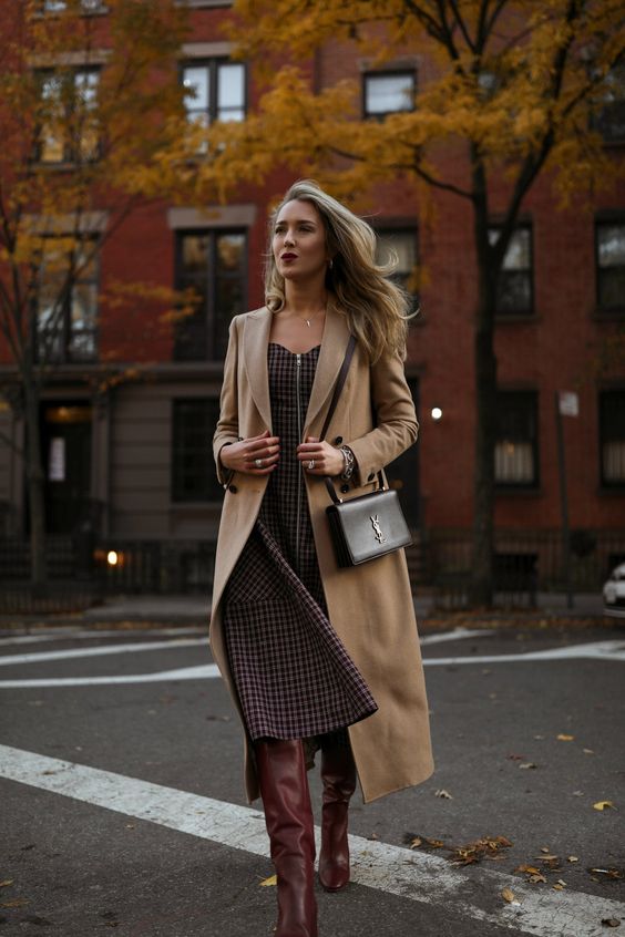 Фустанот го комбинираме со капут во беж боја и бордо чизми до колена. Вака стилизирани додаваме црна чанта за комплетирање на стајлингот.