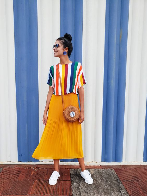 Расположени сме за плисирано здолниште во сончогледова боја коешто го спојуваме со шарена маичка.
