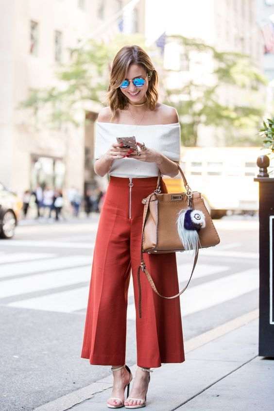 За овој пост празничен петок предложуваме корално црвени панталони со широк крој, над глужд.