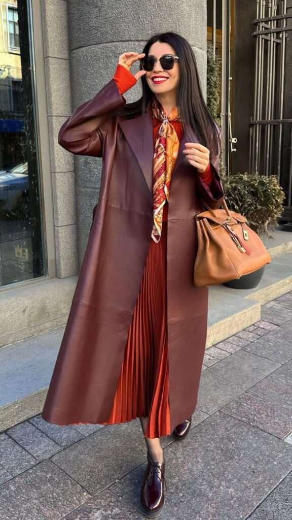 Петочки сме расположени за плисирано здолниште во корално црвена нијанса. Дополнуваме со црвена блуза и кожен, бордо мантил.