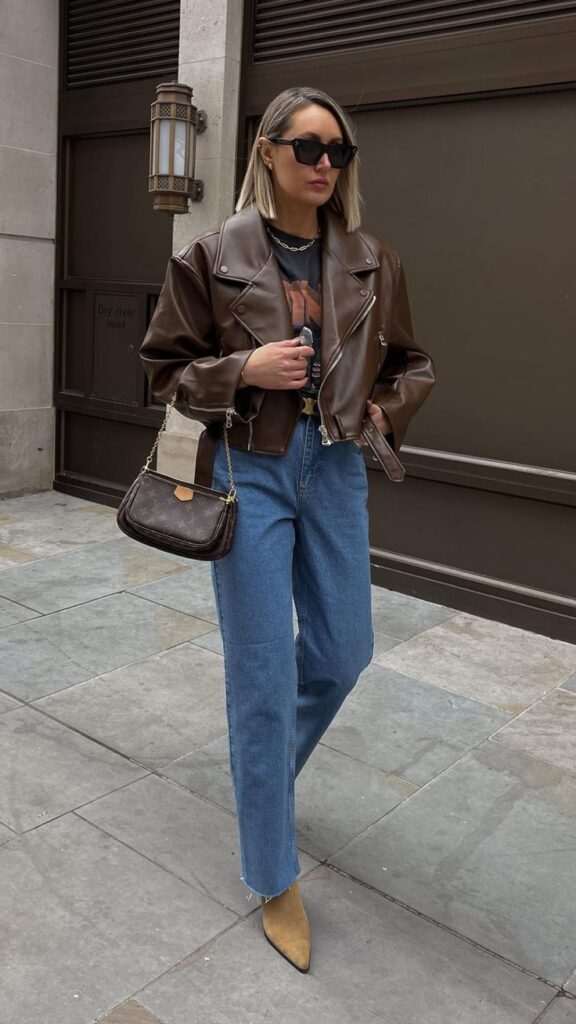 Петок во кожна јакна и џинс Крајот на оваа скратена работна недела е резервиран за кафеава кожна јакна и црна маичка со принт. Петочкиот стајлинг го дополнуваме со класичен џинс и крем чизми од превртена кожа. Финишираме со кафеава чанта. Имајте убав викенд. Фото: Pinterest Претходна статија Доза есенска инспирација за уредување на вашите балкони Следна статија Моден камбек: Карираните кошули повторно во центарот на вниманието