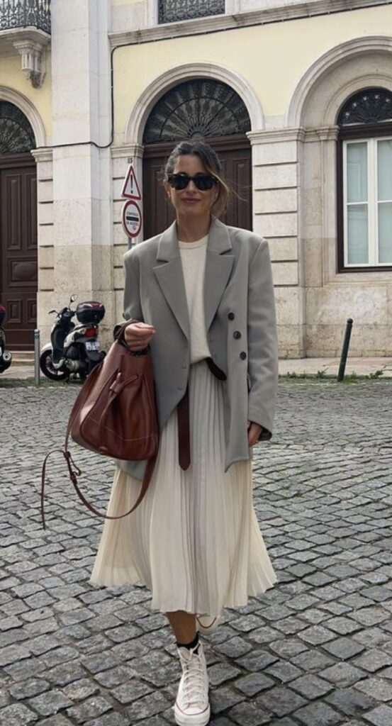 Денешниот предлог е крем, плисирано здолниште и кремава маичка, коишто ги спојуваме со светло сив блејзер.