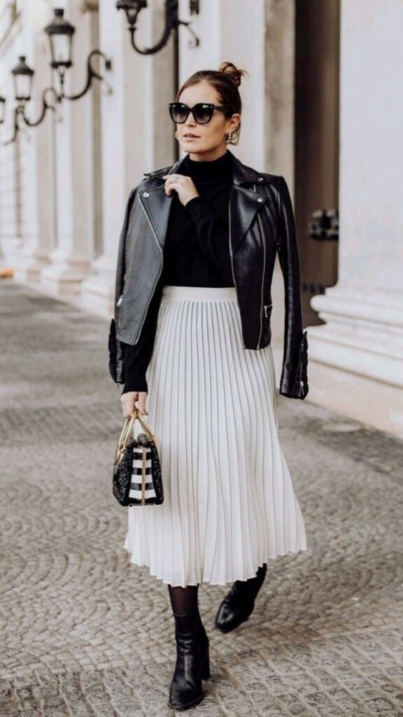 Петочкиот стајлинг ни е обоен црно-бело. Како за пред викенд имаме комбинација од бело плисирано здолниште, црна ролка и кожна јакна.