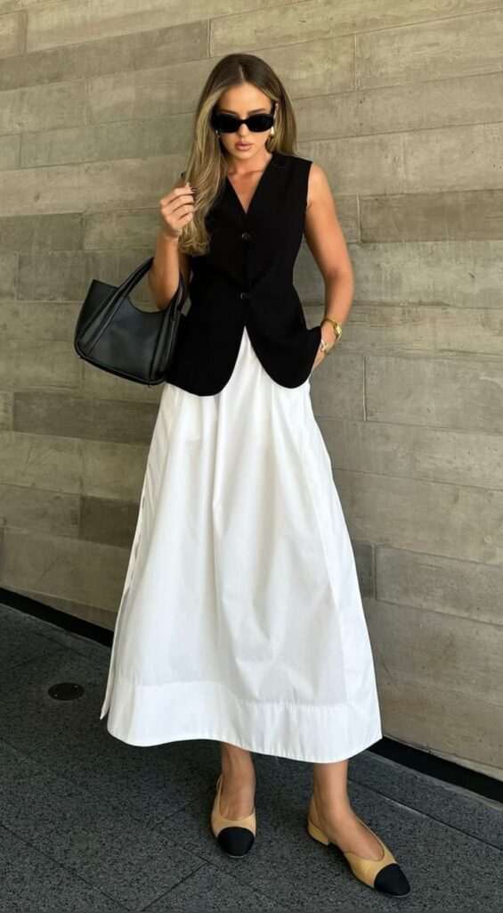 Понеделнички предложуваме бело макси здолниште коешто го спојуваме со црн елек.