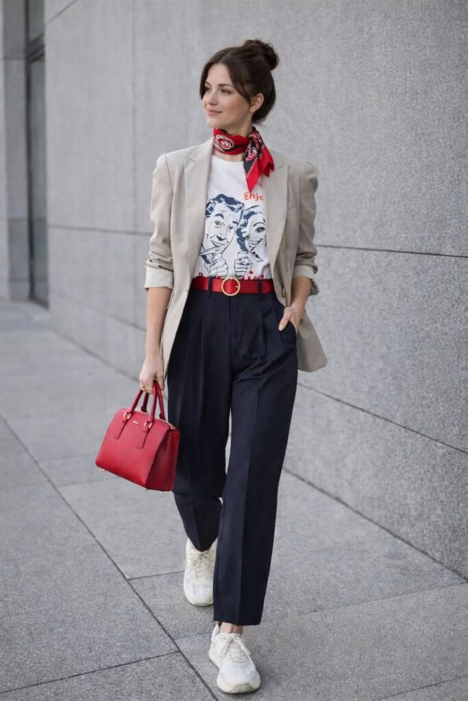 Понеделник со црвени детали Работната недела ја започнуваме со темно сини панталони и бела маичка со принт. Додаваме беж блејзер и бели патики, а финишираме со црвен ремен, чанта и марама во три нијанси. Имајте убав ден. Previous Article 30 години во градежништвото: Награда на Елена Лука за најуспешна жена менаџер Next Article ELENA LUKA и фустанот што изгледа како милион долари