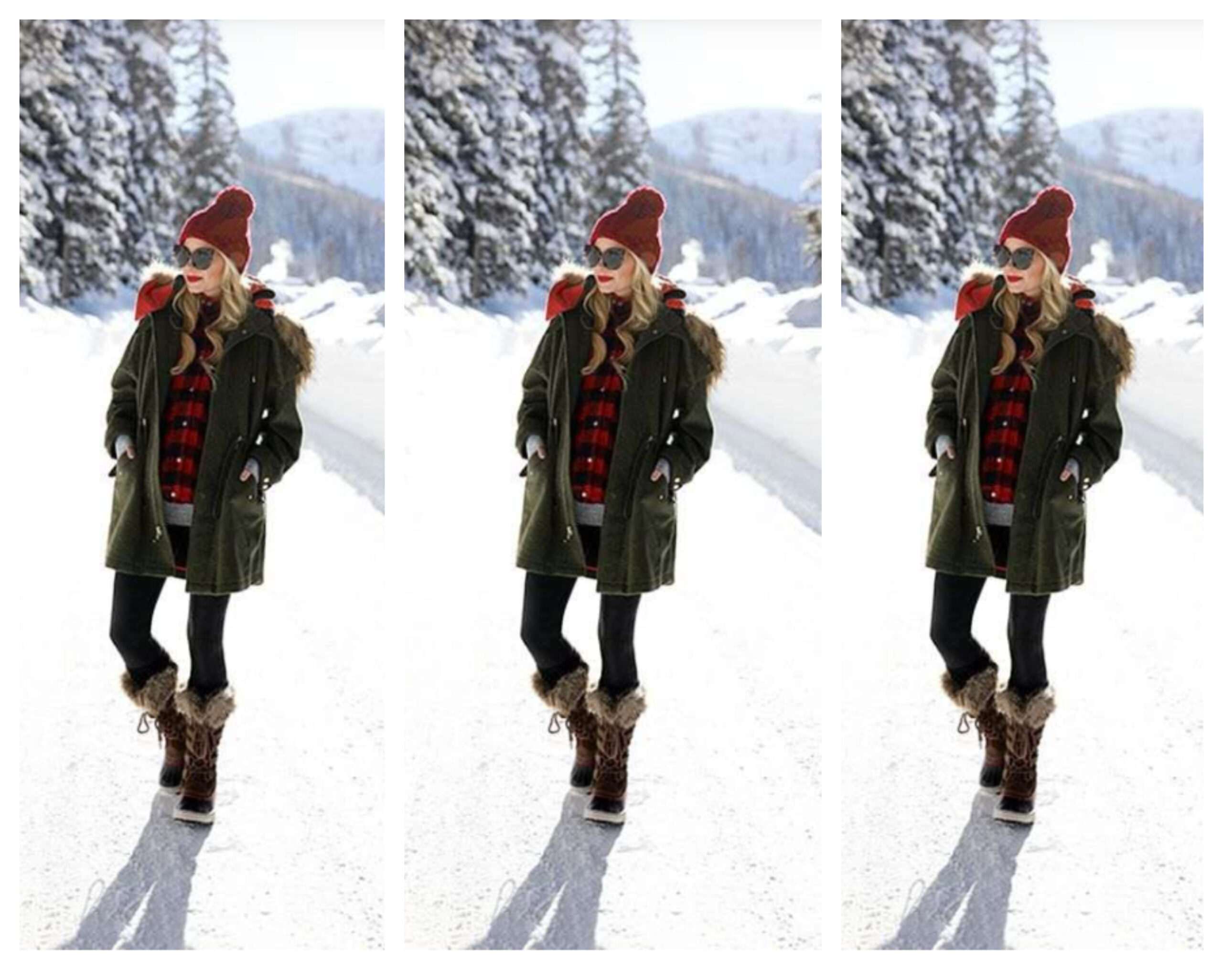 Комбинирана со класични црни хеланки и чизми со крзно и врвки, оваа комбинација е идеална за прошетки низ снежни пејзажи со леснотија и стил. Смелата црвена плетена капа и големите очила за сонце го заокружуваат изгледот, додавајќи игрива, а сепак шик нота.