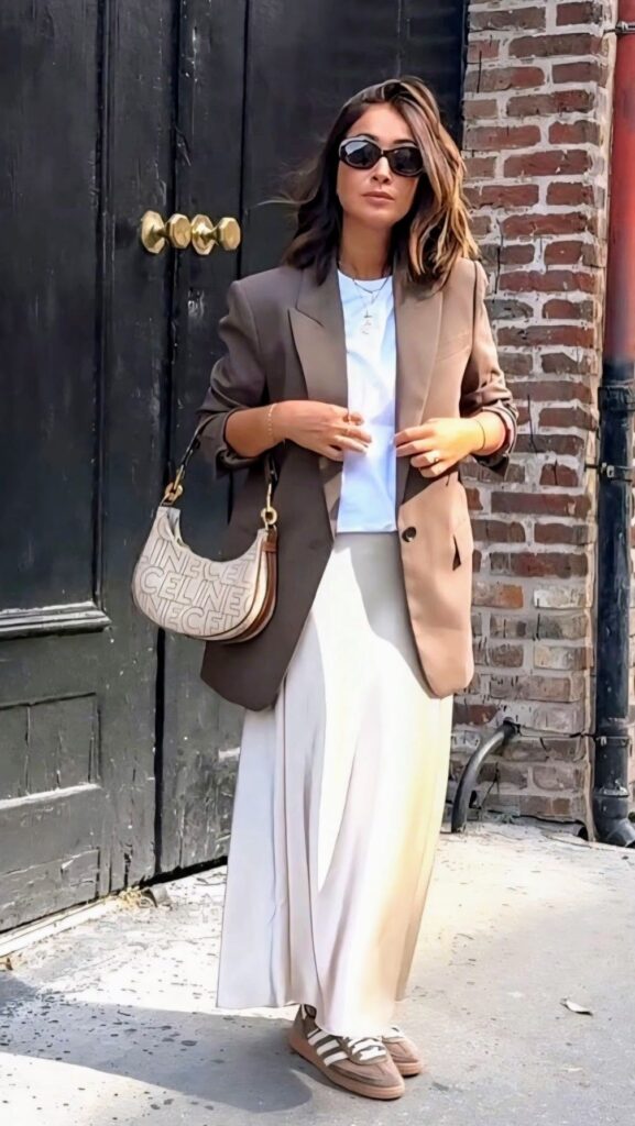 Оваа работна недела ја започнуваме со макси свилено здолниште во крем нијанса. Комбинираме со бела маичка и блејзер во кафена боја.