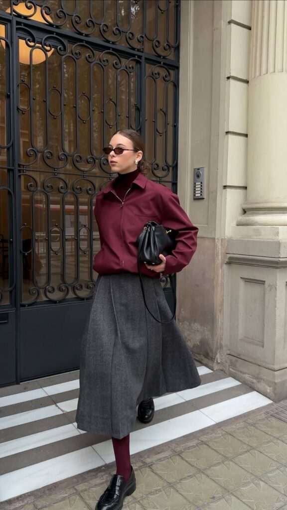 Оваа работна недела ќе ја започнеме со сиво, миди здолниште коешто ќе го споиме со бордо ролка.