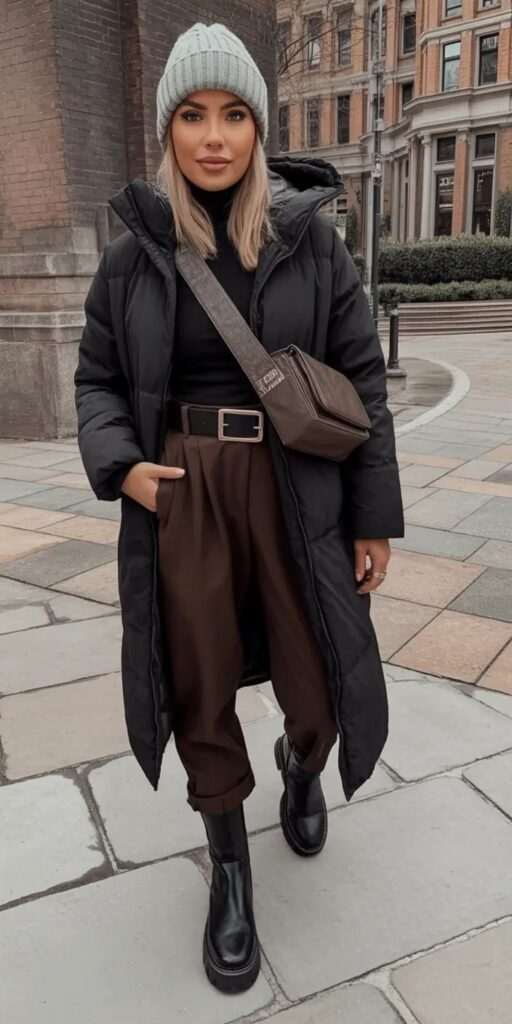 Додаваме макси, црна јакна и рамни чизми во иста боја. Финишираме со светло кафеава чанта и сиво капче.