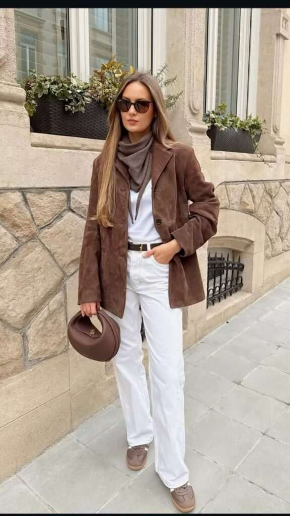 Работната недела ја започнуваме со кафено бела комбинација. Понеделнички имаме бели фармерки и бела блуза дополнети со кафеаво палто од превртена кожа.