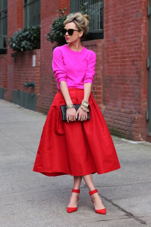Црвено широко здолниште е вистински погодок за убав старт на работната недела и новиот месец. Црвената боја е доминантна, а комбинацијата со розова памучна блузичка делува самоуверено и стилски префинето. Во комплет со ниски црвени штикли со ремче и црна плик чанта ќе изгледате подготвени за секој предизвик што ве очекува.
